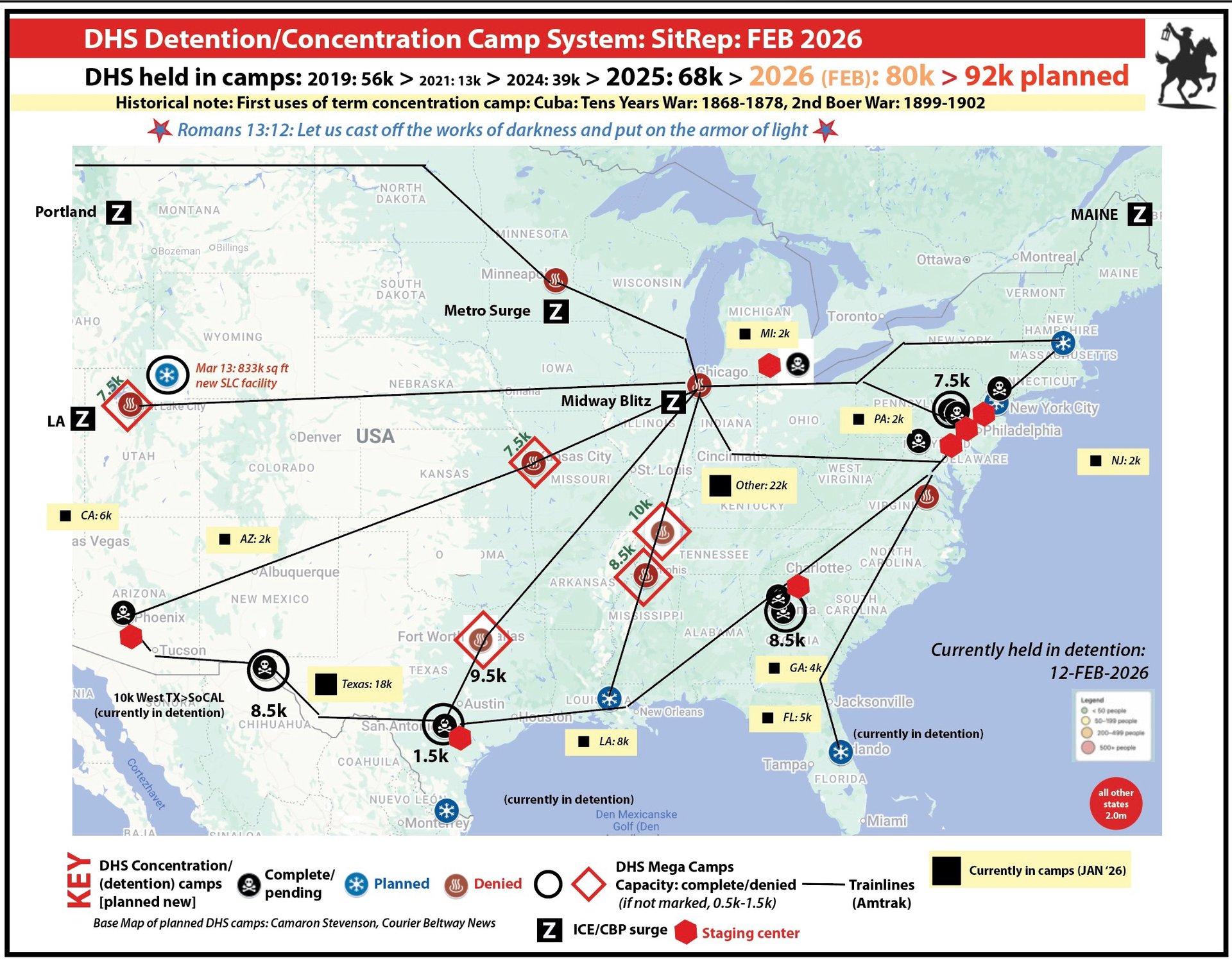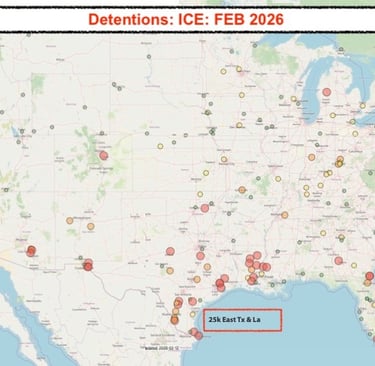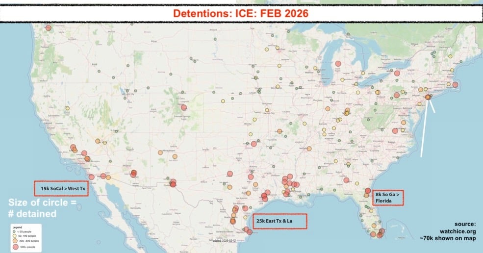 As of February 2026, ICE held ~75,000 detainees in privately operated or government owned detention facilities - up from ~40,000 in January 2025. About 60% of those detainees are held in Southern California, Texas, Louisiana, Florida and Georgia.