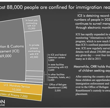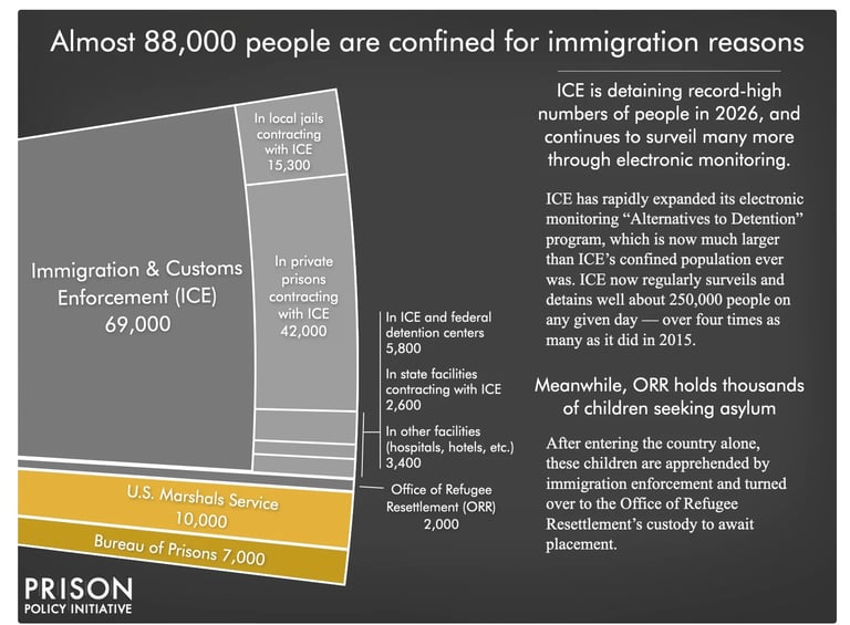 As of March 2026, The Prison Policy Initiative (PrisonPolicy.org) reported that ~88,000 detainees have been confined for immigration purposes. Detainees are held in a rapidly expanding system of public and private jails and detention facilities.