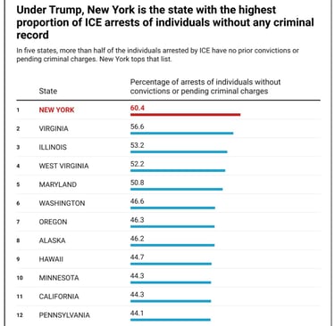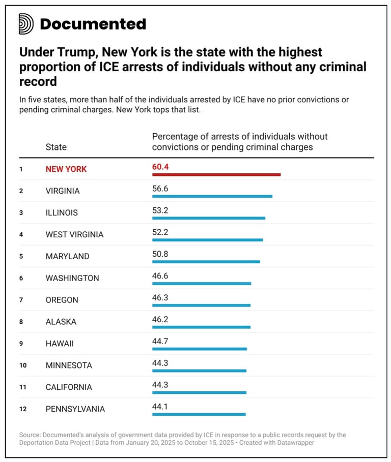From January through October 2025, New York State has seen the highest percentage of ICE arrests, at ~60%, of individuals with no prior convictions or criminal charges. In Minnesota, ~44% of arrested individuals had no criminal record.