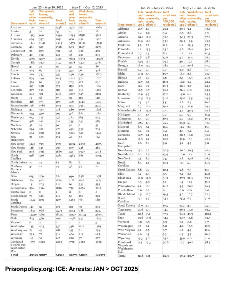 The Prison Policy Initiative (PrisonPolicy.org) has delineated ICE and CBP arrest rates by State for two recent periods spread across January through October 2025.